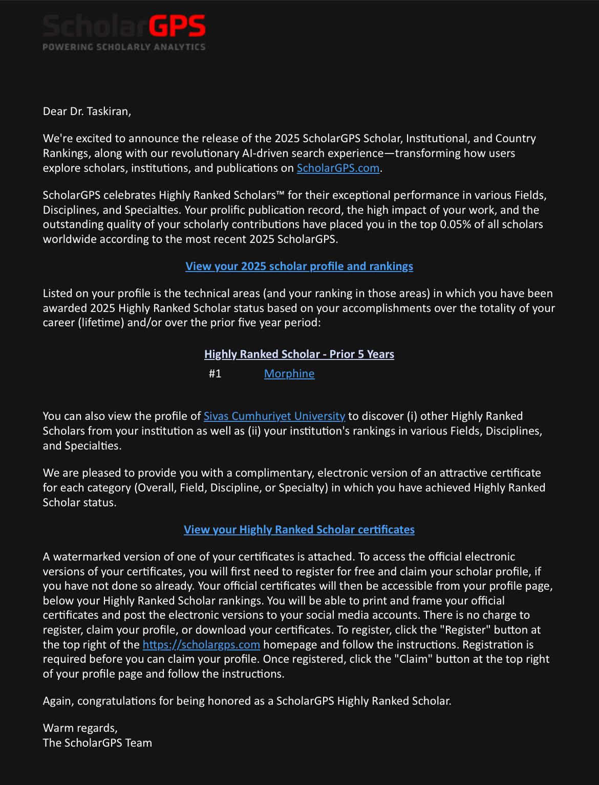 ScholarGPS tarafından son 5 yıllık akademik performans esas alınarak yapılan alan bazlı değerlendirmede Doç. Dr. Ahmet Şevki Taşkıran, “Morphine” (Morfin) başlığı altında dünya genelinde 1. sırada (#1) yer aldı. Bu sonuç, Taşkıran’ın fizyoloji ve deneysel farmakoloji alanlarında yürüttüğü özgün, yüksek etki değerine sahip bilimsel çalışmaların uluslararası ölçekte en üst düzeyde karşılık bulduğunu açıkça ortaya koydu.