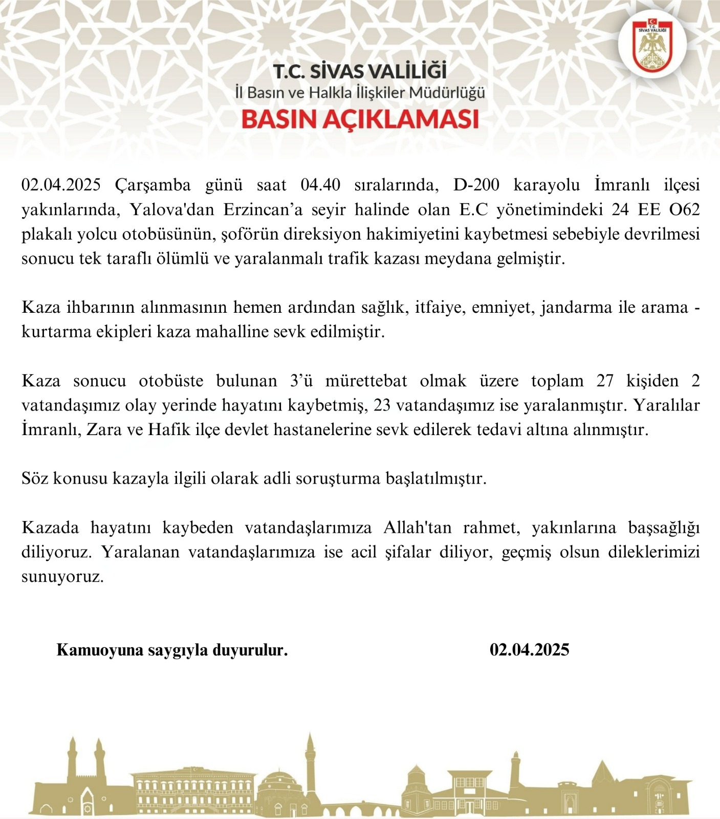 02.04.2025 Çarşamba günü saat 04.40 sıralarında, D-200 karayolu İmranlı ilçesi yakınlarında, Yalova'dan Erzincan’a seyir halinde olan E.C yönetimindeki 24 EE O62 plakalı yolcu otobüsünün, şoförün direksiyon hâkimiyetini kaybetmesi sebebiyle devrilmesi sonucu tek taraflı ölümlü ve yaralanmalı trafik kazası meydana gelmiştir.