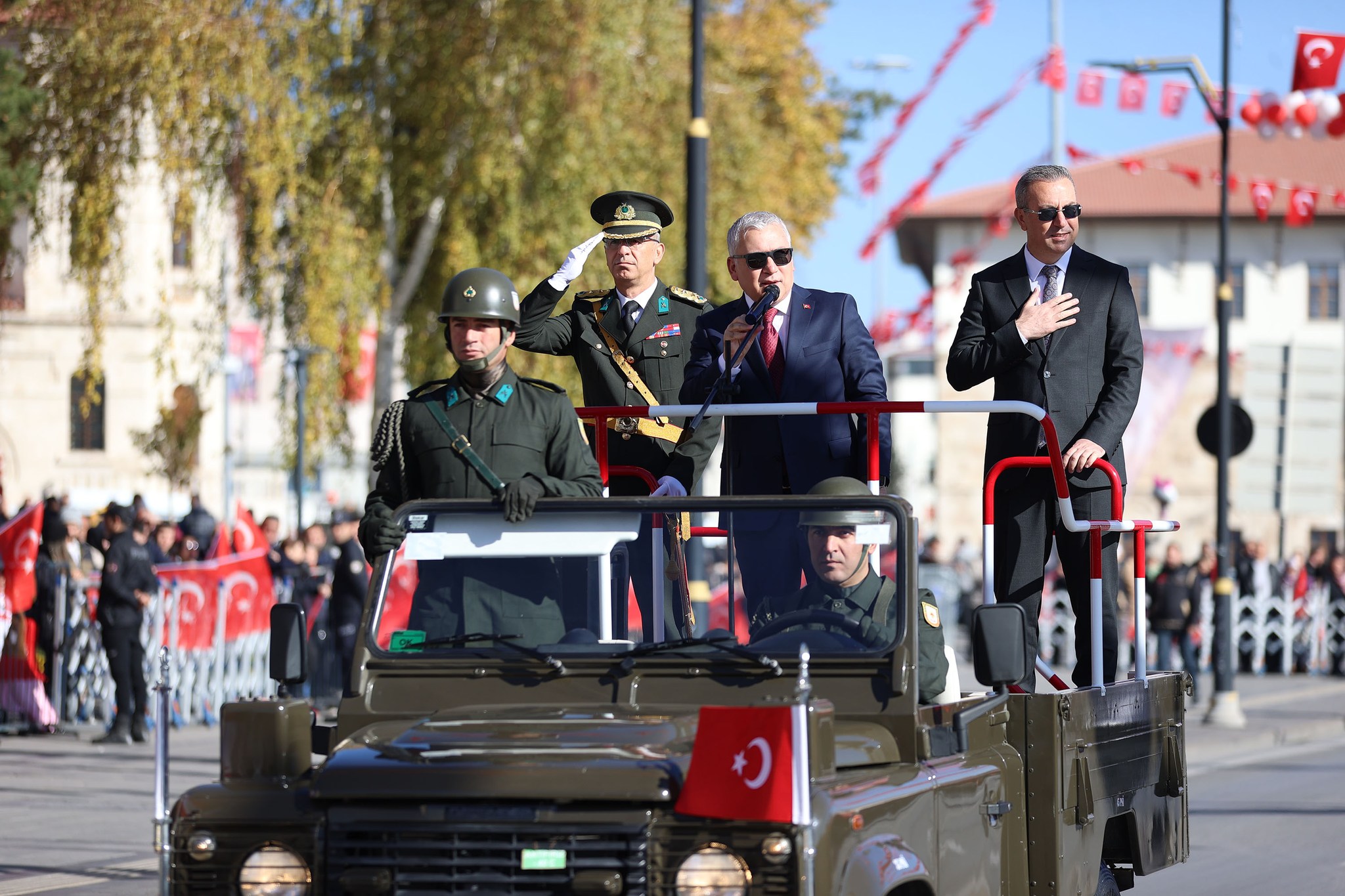 Vali Yılmaz Şimşek, Garnizon Komutanı Piyade Albay Cüneyt Mutlu ve Sivas Belediye Başkanı Adem Uzun, askeri araçla halkı selamladı.