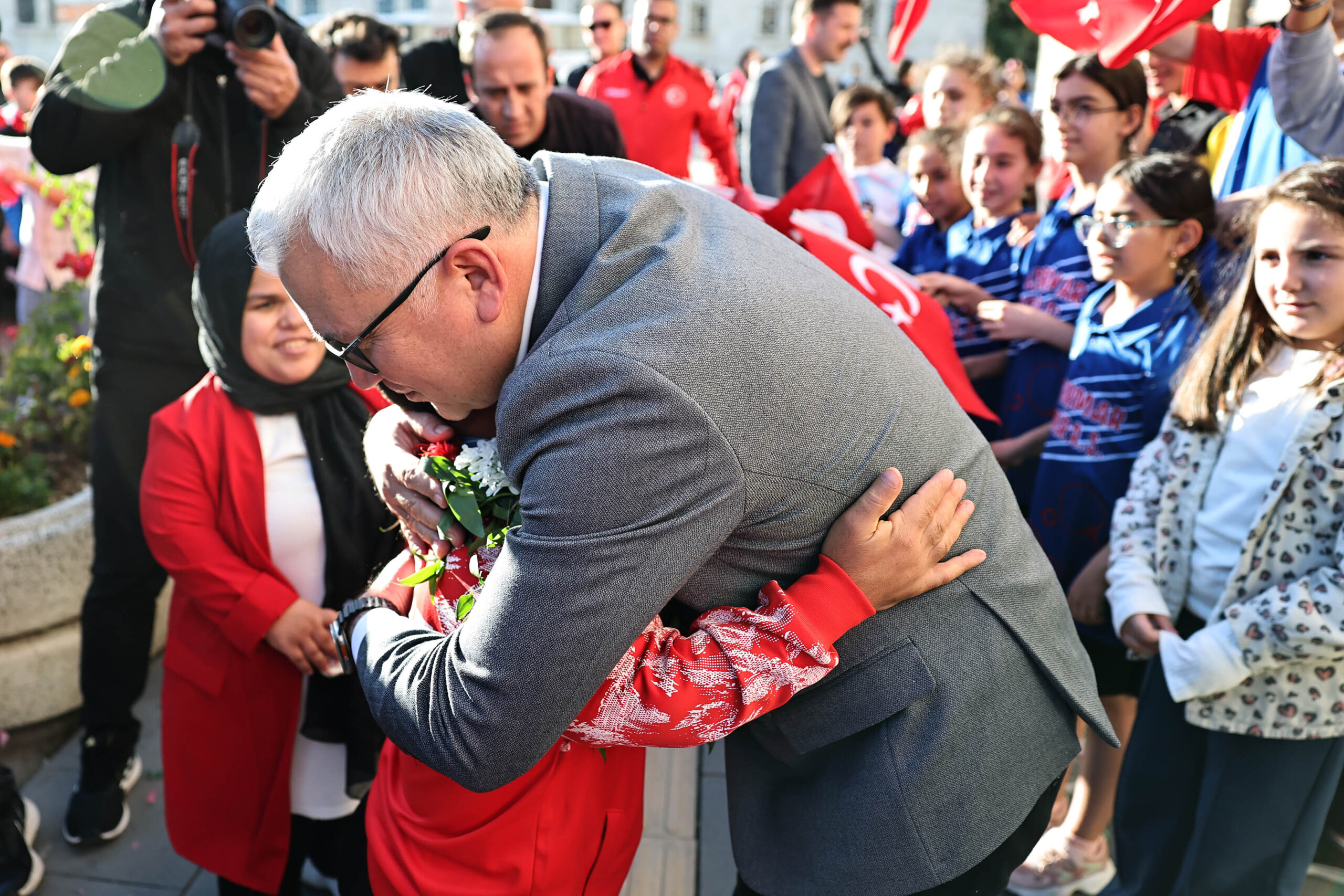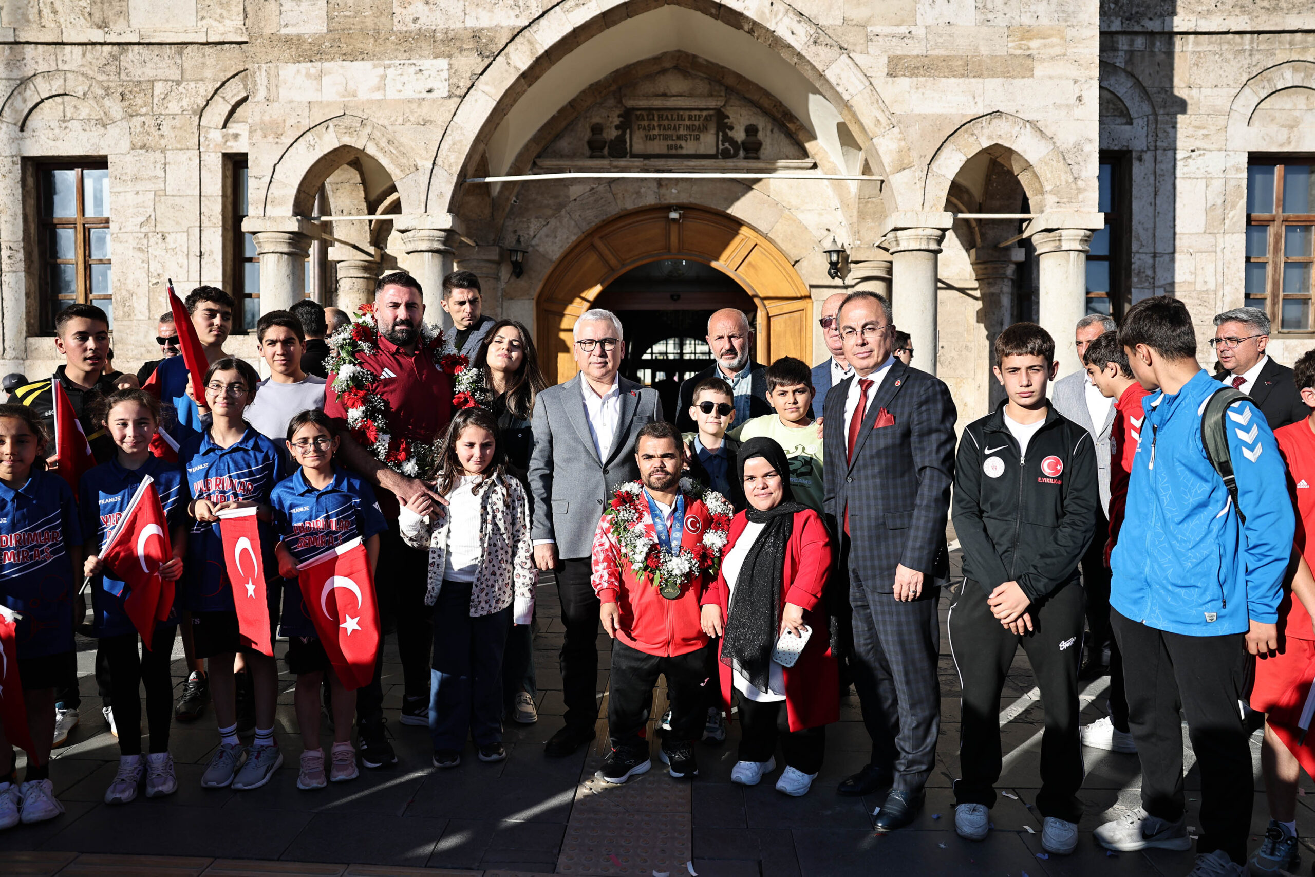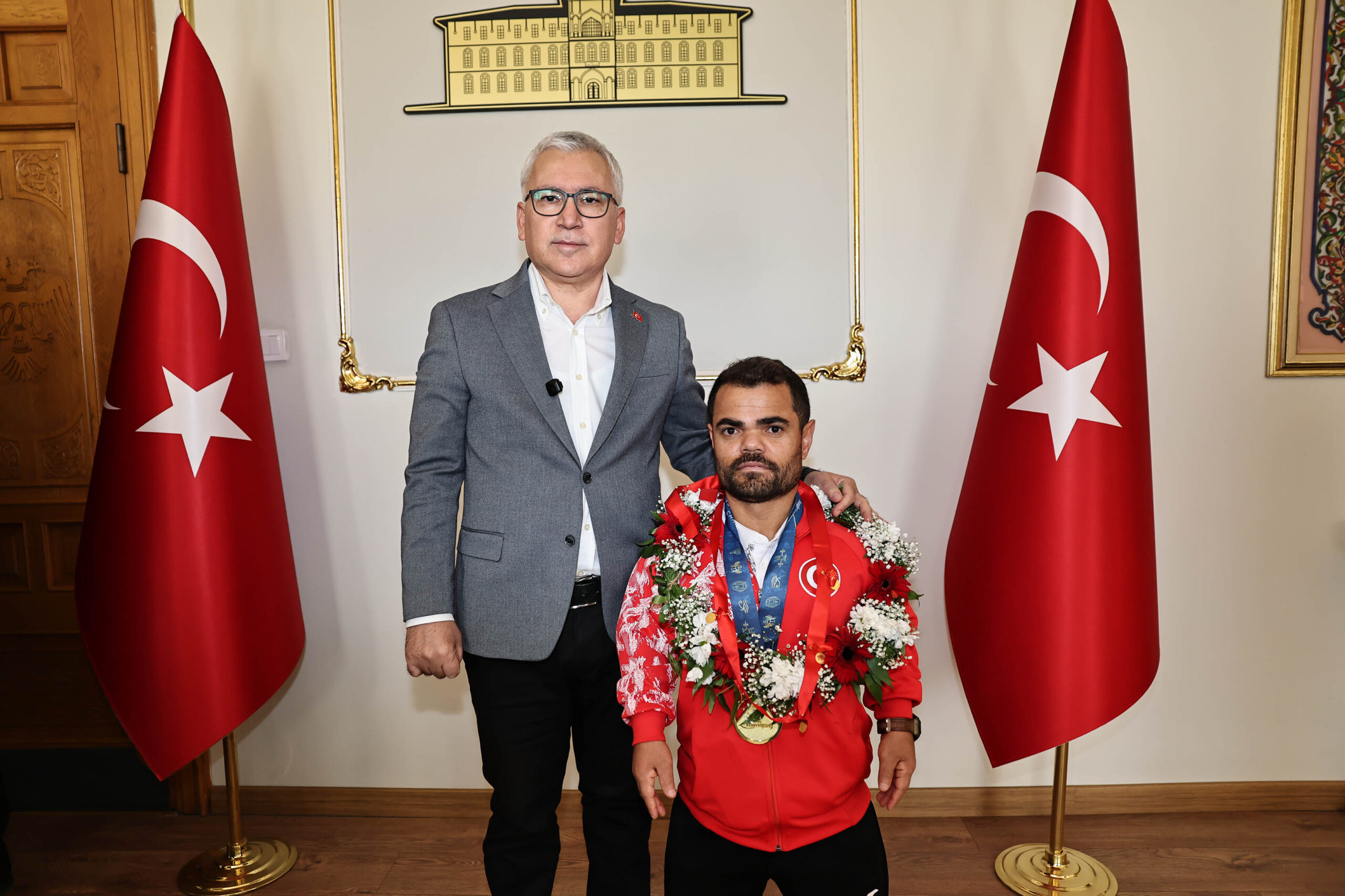 Konvoy eşliğinde Sivas Valiliği'ne gelen dünya şampiyonu Kayapınar, Vali Yılmaz Şimşek tarafından karşılandı.