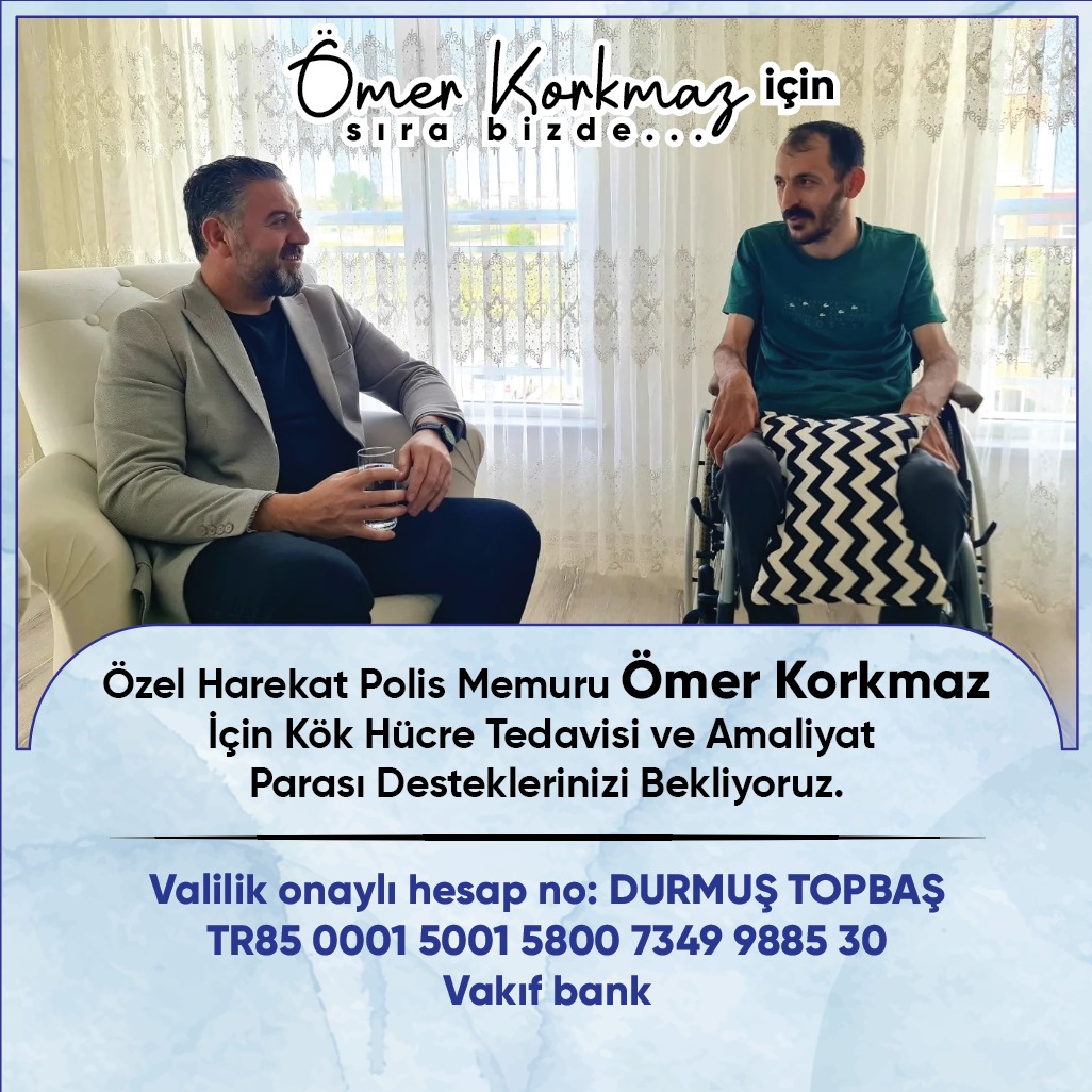 Sivas Valiliğinin desteklediği Vatanı için fedakârca görev yapan Ömer Korkmaz, geçirdiği ağır bir rahatsızlık sonucu felç kaldı. Uzmanların önerdiği kök hücre tedavisi, onun yeniden sağlığına kavuşması için şart. Ancak bu süreç, yüksek maliyetler gerektirdiğinden hepimizin desteğine ihtiyacı var.