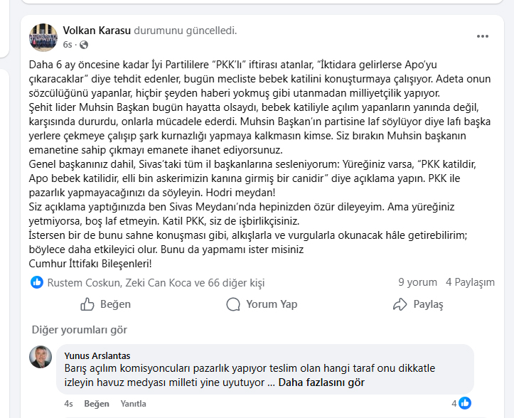 Karasu paylaşımında, daha önce İYİ Partililere yönelik “PKK’lı” suçlamalarında bulunanların bugün Meclis’te “bebek katilini konuşturmaya çalıştığını” öne sürdü. Karasu, “Daha 6 ay öncesine kadar İYİ Partililere ‘PKK’lı’ iftirası atanlar, ‘İktidara gelirlerse Apo’yu çıkaracaklar’ diye tehdit edenler, bugün mecliste bebek katilini konuşturmaya çalışıyor. Onun sözcülüğünü yapanlar utanmadan milliyetçilik yapıyor.” ifadelerine yer verdi.